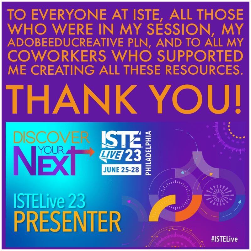 Thank you to ISTE for letting me present and accommodating my changes from in person to Virtual. Because of the format, it was more of a tech talk than an interactive group session.