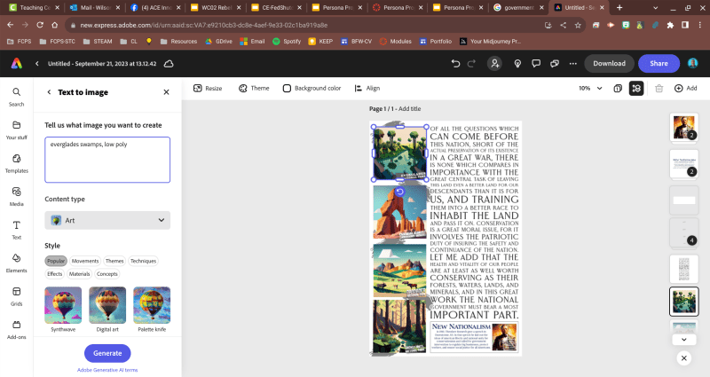 In the state of Kentucky, new legislation developed a list of required primary reading sources for all secondary social studies classes. One of the unique additions is Theodore Roosevelt’s New Nationalism speech from 1910. (See the speech here) So, I thought why not take the Conservation section of his speech and make a poster out of it. My problem was the need for graphics in the poster. What I did was create a newspaper style layout in an 11×17 poster template. I made room for three images on the left side of the poster and then generated my first image using the Adobe Firefly AI generator.