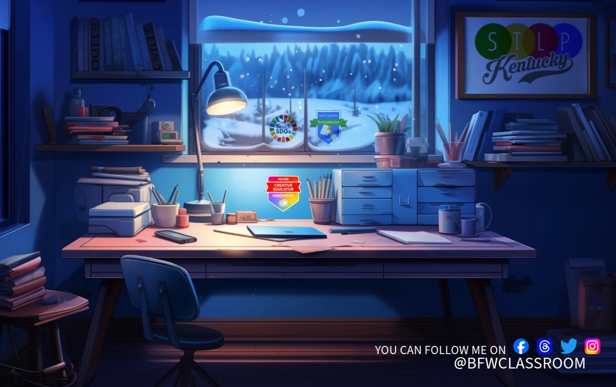 The initial version featured a scene in an apartment with a view of the city, showcasing the creative area of a home office using Firefly. Subsequent adjustments were made to the image, such as incorporating Generative Fill to change the city scape to a snowy countryside and produce an empty picture frame in the upper corner to accommodate the addition of the STLP logo as a poster. Furthermore, stickers displaying the Teach SDGs, Google Ambassador, and ACE Innovator badges were included in the image using the Multiply tool. Additionally, I relocated the Social Media follows feature. Initially situated in the bottom right, I observed that my camera obstructed this area, prompting me to relocate them to the top left.