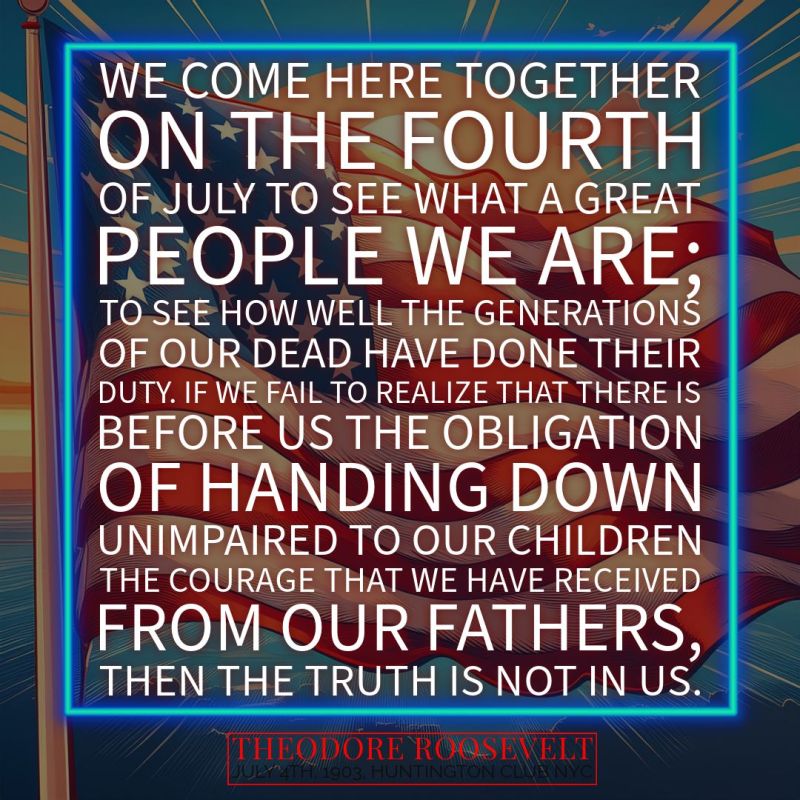 You people here in Huntington showed it by the way in which your young men went to the front. You showed that the spirit of Nathan Hale still lived in America. No amount of talking of what had been done in the Revolution would have availed anything if you had not had it in you to add to these great memories by the deeds which were to make, in their turn, forever memorable the years between the firing of Fort Sumter and Appomattox. So we come here together on the Fourth of July to see what a great people we are; to see how well the generations of our dead have done their duty. If we fail to realize that there is before us the obligation of handing down unimpaired to our children the courage that we have received from our fathers, then the truth is not in us. We can pay to the great men of the past the only homage really worth paying if we show by our deeds that their spirit still lives in our souls. Only by so doing can we show that we have a right to celebrate this day that marks the birth of a nation.