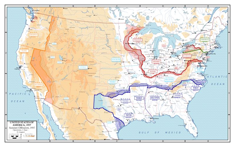 A map I found online shows an intriguing “what if” scenario in American alternate history: a hypothetical Second American Civil War in 1937 during the Great Depression. While this never happened, it has captured the interest of historians, game designers, and educators examining the social and political tensions of that time. I am fascinated by these historical “what if” scenarios and enjoy exploring them in various ways. AI has helped me predict political outcomes and balance what I know with unknowns. Recently, while creating a collection of digital maps for my school’s history department, I discovered an interesting US Military Academy war campaign map.