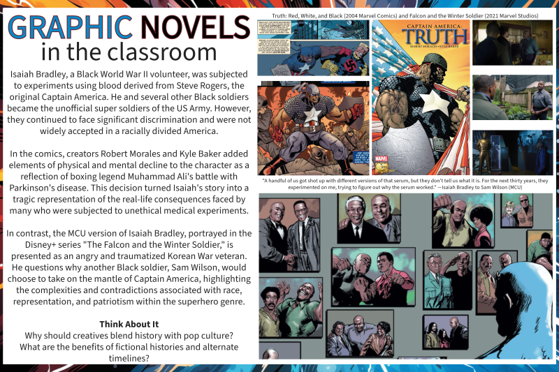 Students learned how comic creators Robert Morales and Kyle Baker added elements of physical and mental decline to Bradley’s character, drawing direct parallels to boxing legend Muhammad Ali’s battle with Parkinson’s disease. This decision transformed Isaiah’s story into a tragic representation of the real consequences faced by many subjected to unethical medical experiments, echoing the horrors of the Tuskegee Syphilis Study. We compared this comic version with the MCU’s portrayal in “The Falcon and the Winter Soldier,” where Isaiah appears as an angry and traumatized Korean War veteran questioning why another Black soldier (Sam Wilson) would choose to take on the Captain America mantle. The poster’s “Think About It” questions sparked rich discussions: “Why should creatives blend history with pop culture? What are the benefits of fictional histories and alternate timelines?” Students grappled with whether using real historical trauma in fictional superhero narratives honors or exploits those experiences, whether reaching younger audiences through popular media keeps important historical lessons alive, and how representation asks not just “are marginalized groups present?” but “how are their stories being told, and who benefits?”