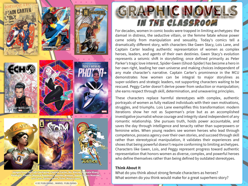 Teachers creating Women’s History Month resources should embrace the opportunity to move beyond tokenistic inclusion of female characters and explore the rich tapestry of women’s historical portrayals and their ongoing evolution. The “femme fatale versus complex hero” framework serves as an engaging entry point for discussing how breaking free from limiting gender stereotypes benefits everyone by expanding the range of stories we can tell. When selecting characters, prioritize those with agency and independence, showcasing women who are defined by their own accomplishments rather than just their relationships with male characters. Include a diverse array of women representing various races, abilities, body types, and backgrounds to highlight that “women’s representation” is vibrant and multi-faceted. Pairing historical examples of past portrayals with contemporary successes can inspire students to celebrate progress while recognizing that there’s still work to be done. Encourage students to identify real women in their own lives whose stories deserve heroic recognition, thus expanding the conversation to include courageous, intelligent, and resilient figures beyond fiction. Be ready to address the ongoing challenge of hypersexualization in comics while also celebrating the narrative improvements, helping students differentiate between female characters created for male audiences and those crafted by and for women readers.