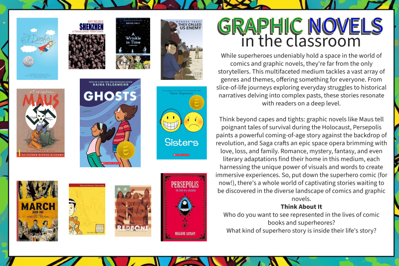 April’s poster circled back to reinforce the message that graphic novels extend far beyond superhero narratives, specifically highlighting works that tell real-life stories and explore diverse human experiences. While superheroes undeniably hold space in comics and graphic novels, they’re far from the only storytellers. This poster showcased works like “El Deafo” (Cece Bell’s memoir about growing up deaf), “They Called Us Enemy” (George Takei’s Japanese American internment experience), “A Wrinkle in Time” (Hope Larson’s adaptation), “Shenzhen” (Guy Delisle), “Maus” (Art Spiegelman’s Holocaust narrative), “Ghosts” (Raina Telgemeier), “Sisters” (Raina Telgemeier), “March” (John Lewis’s civil rights memoir), “American Born Chinese” (Gene Luen Yang), “Redbone” (Christian Staebler), and “Persepolis” (Marjane Satrapi’s coming-of-age story during the Iranian Revolution).