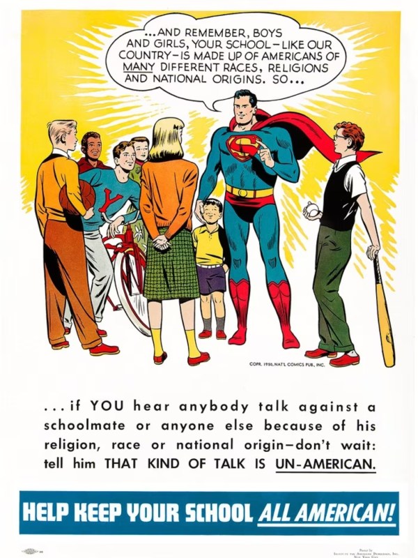 I launched the spring semester with a poster featuring powerful quotes from two heroes representing different eras and perspectives on heroism and service. The first image showed a classic 1950 Superman public service announcement where he tells a diverse group of children: “And remember, boys and girls, your school—like our country—is made up of Americans of many different races, religions and national origins. So… if you hear anybody talk against a schoolmate or anyone else because of his religion, race or national origin—don’t wait: tell him THAT KIND OF TALK IS UN-AMERICAN.” The poster concluded with “HELP KEEP YOUR SCHOOL ALL AMERICAN!” This vintage comic demonstrated how superheroes have long been used to promote tolerance and combat prejudice, speaking directly to young readers about their responsibility to stand up against discrimination.