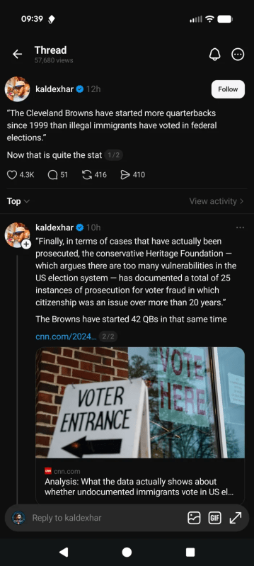 This claim is mostly true and well-supported by evidence. The Cleveland Browns have indeed started a large number of quarterbacks since 1999, and documented cases of undocumented immigrants voting in federal elections are extremely rare; over 20 years, even a conservative organization that actively looks for fraud found only 25 prosecuted cases nationally.